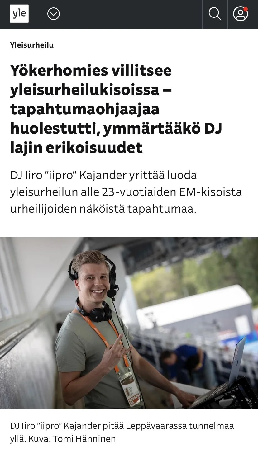 DJ Iiro “iipro” Kajander DJing the European Athletics Championships U23 in Leppävaara (Espoo), Finland in 2023. Titled as “The Nightclub Man” to bring the party energy from the hottest nightclubs to the globally recognized sports event. Covered by the National Media house YLE Sports.